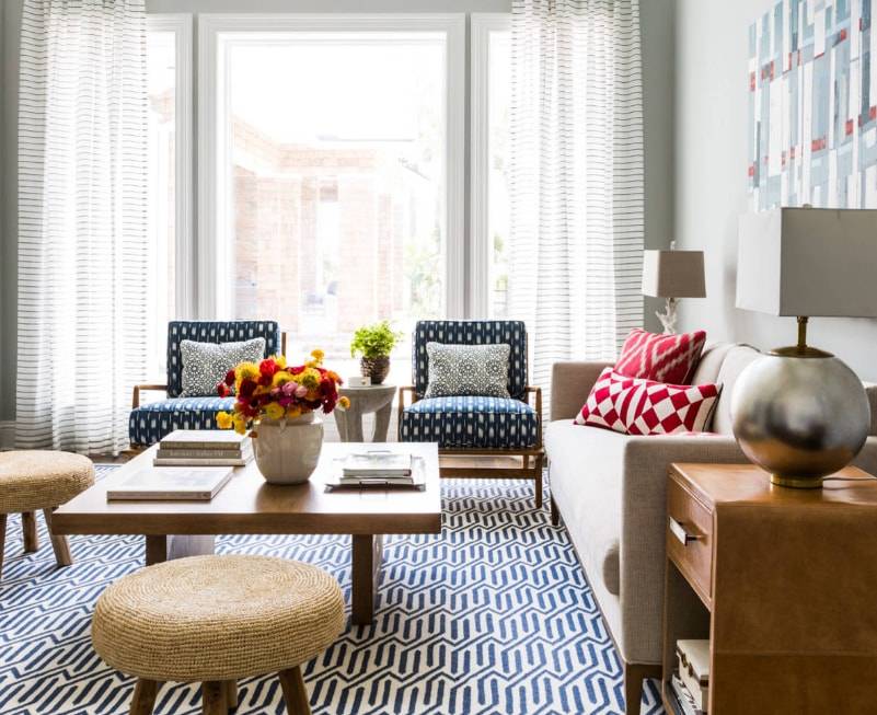 Однако яркие шторки обязательно должны перекликаться с элементами отделки или меблировки.