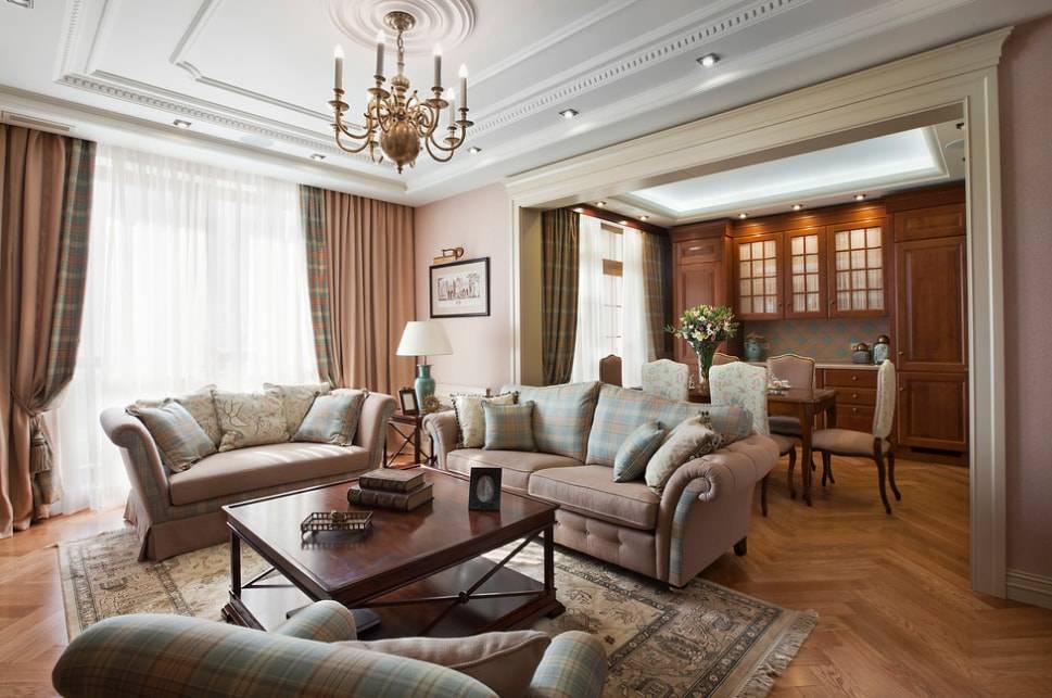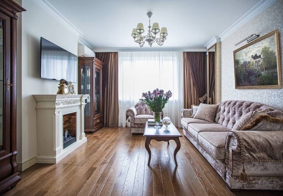 Сегодня традиционным сочетанием плотных длинных портьер насыщенных цветов и белоснежного или в тон им тюля чаще всего оформляют залы, выполненные в классическом стиле.
