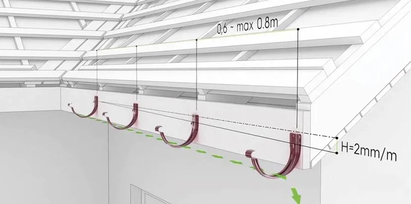Для эффективного отвода воды форма и конструкция водостока выбирается заранее. При монтаже понадобятся не только прямые, но и угловые элементы слива, соединяющие части системы на соседних стенах; не обойтись и без торцевых заглушек.