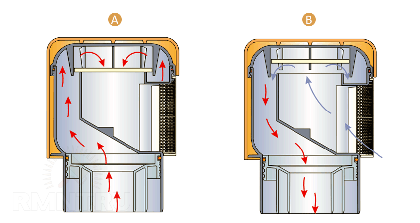 Принцип действия аэрационного клапана: А — клапан закрыт; В — клапан открыт