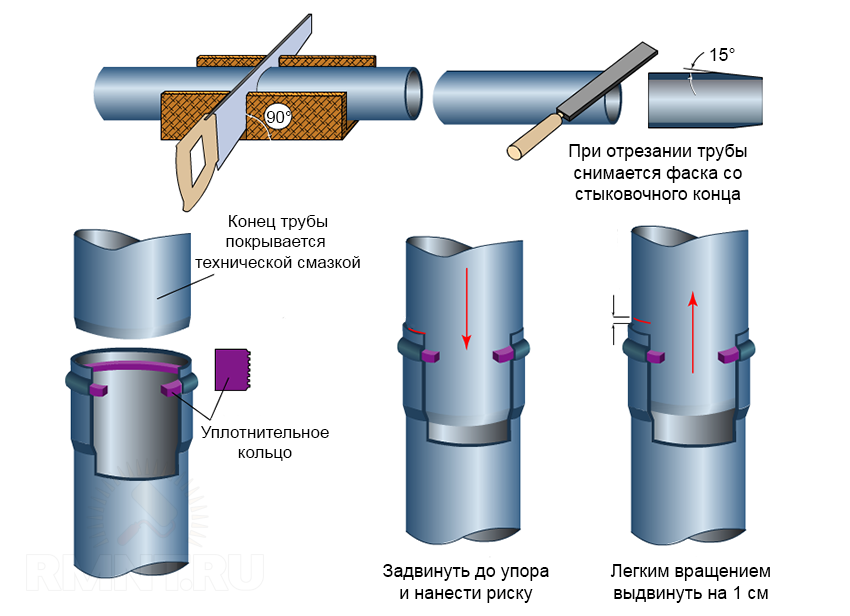 При соединении труб, которые могут нагреваться в летний период, оставляйте небольшие (до 10 мм в длину) зазоры между трубой и раструбом на температурное расширение или на удлинение в результате давления грунта. Место соединения канализационной трубы с входом в очистное сооружение нужно герметизировать и упрочнить — можно прочной верёвкой, пропитанной солидолом.