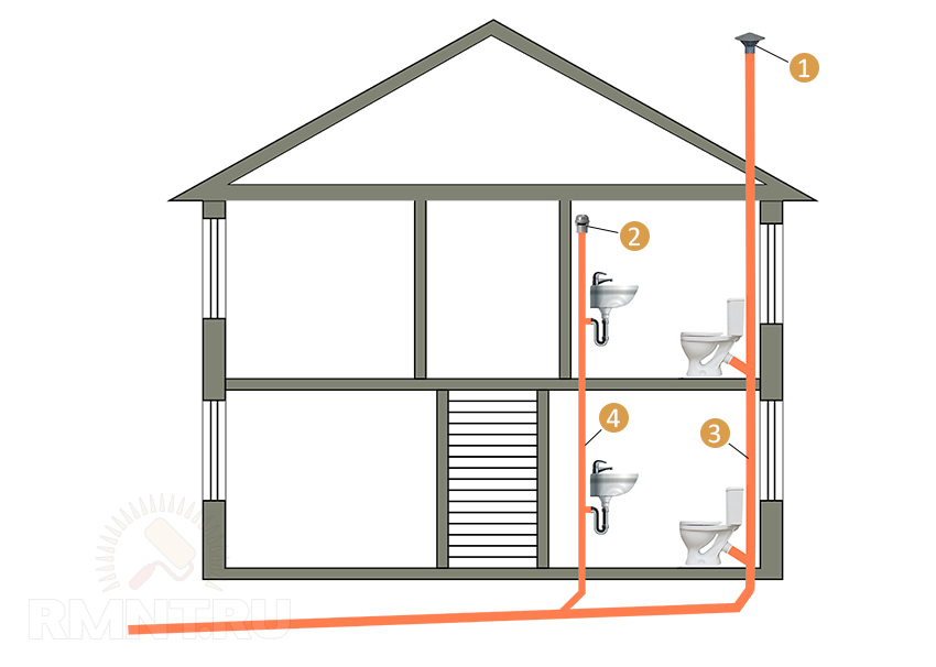 Верхняя часть канализационного стояка (фановой трубы) выводится выше уровня кровли минимум на 50 см и открыта для вентиляции и компенсирования перепадов давления в период сливов из одной или нескольких точек. На тупиковых стояках, не выходящих на крышу, устанавливают аэрационные клапаны. Нижняя часть стояка опускается ниже пола первого этажа, желательно в подвал, и выводится трубой такого же или большего диаметра за пределы дома.