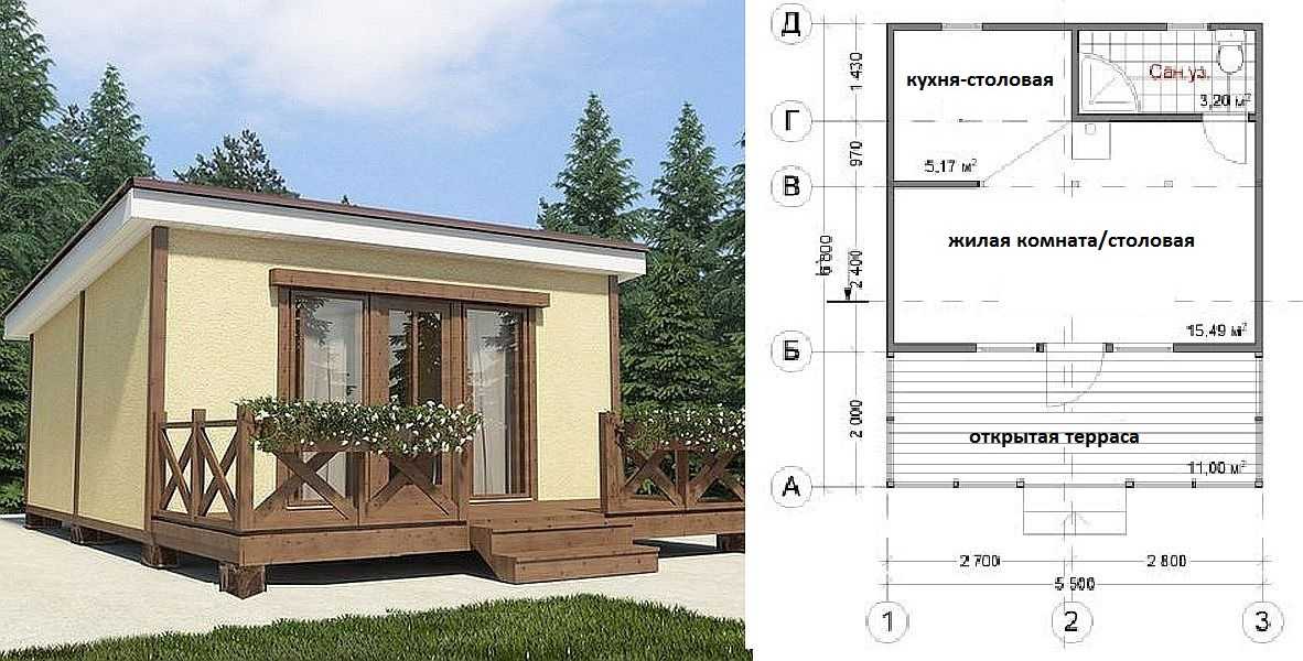 Проект дачного дома с санузлом и открытой террасой под односкатной крышей