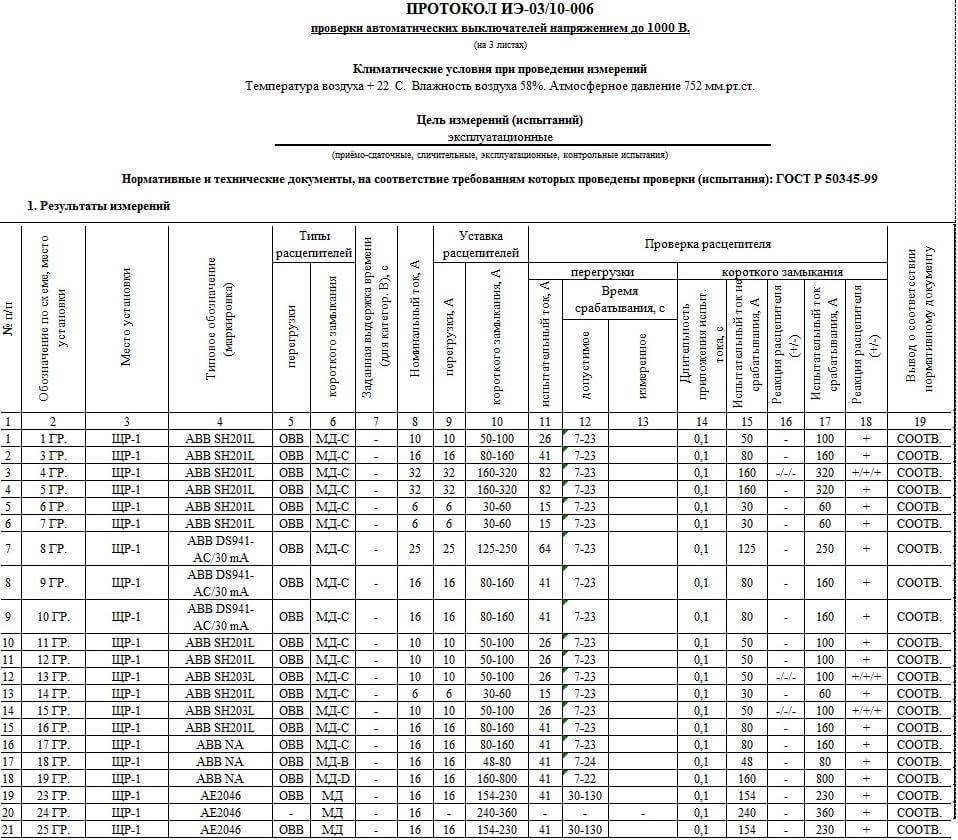 Протокол прогрузки автоматических выключателей по ПУЭ