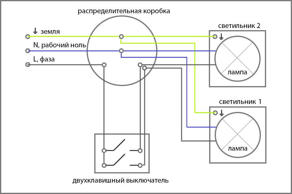 Количество соединений в распределительной коробке значительно увеличивается, и возникает проблема — все спрятать внутри нее. Кроме того, маркировка кабеля также усложняется. В продаже можно найти двухклавишные выключатели Legrand. Модель довольно редкая и не всегда доступная. Электрики обычно стараются разделить подобную схему на две простые.