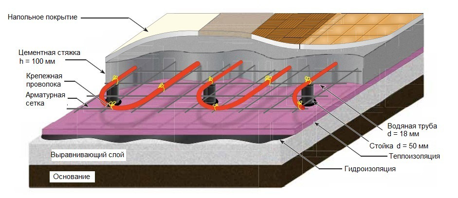ССЫЛКА! Укладка водяных полов в бетонную стяжку является предпочтительным методом укладки, так как образовавшаяся корка обеспечивает трубам оптимальную защиту от повреждений, а также эффективное и равномерное распределение тепла и теплопередачу в помещении.
