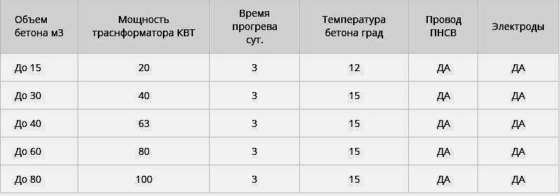 Некоторые наши арендаторы интересуются подключающей схемой обогрева цемента с использованием ПНСВ-проводов, а также схемой обогрева с использованием электродов для колонн. Существуют две схемы: формат «звезды» или «треугольника». Именно схема в формате «треугольник» применяется при подключении трансформаторного аппарата. Схема размещения электродов или на нагревательных петель, холодных концов и шин на объекте должна рассчитываться и проектироваться энергетиком. В его обязанности также входит принятие решение о том, при каком температурном режиме и сколько времени будет прогреваться цемент. Информация о прогреве бетона в холодное время года при помощи электродов либо провода ПНСВ приведена в таблице: