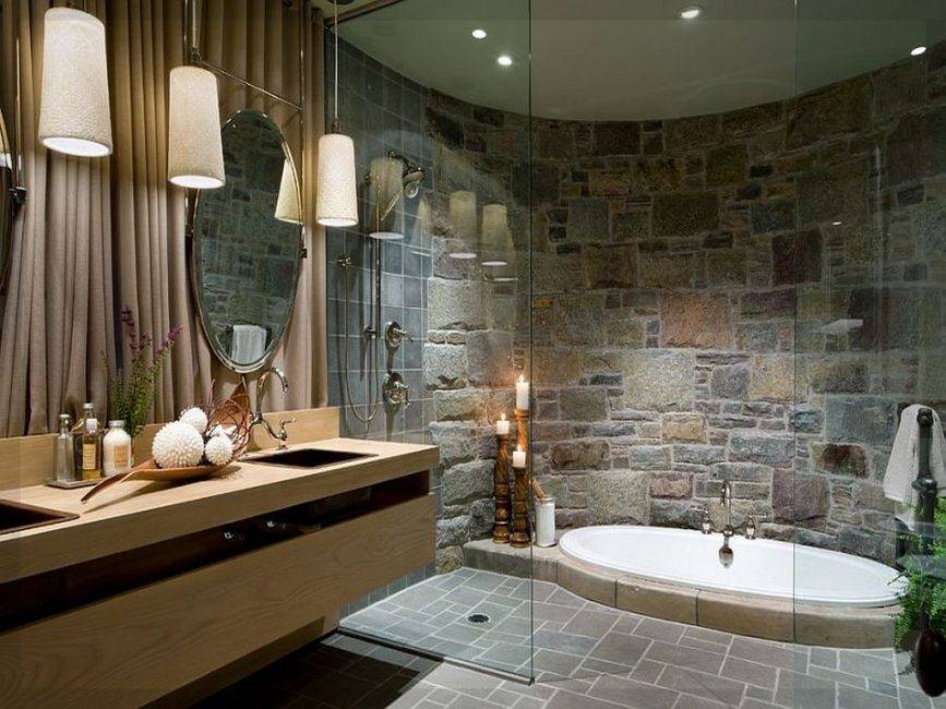 Отделка ванной комнаты искусственным камнем может быть разной: