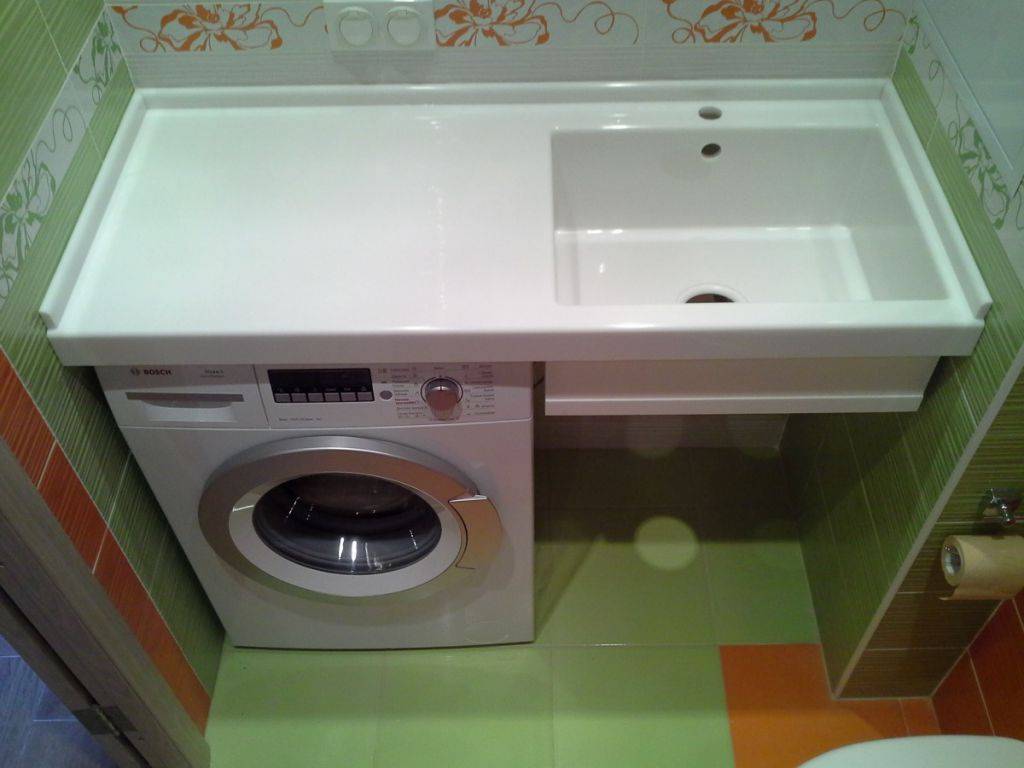 Если площадь сильно ограничена, все место под раковиной займет техника, а столешница будет служить защитной прослойкой. Она может быть из дерева, натурального или искусственного камня, акрила или ДСП с ламинацией под мрамор или дерево. Главное, чтобы материал был водостойким сам по себе или покрыт влагоотталкивающим лаком в случае с деревом.