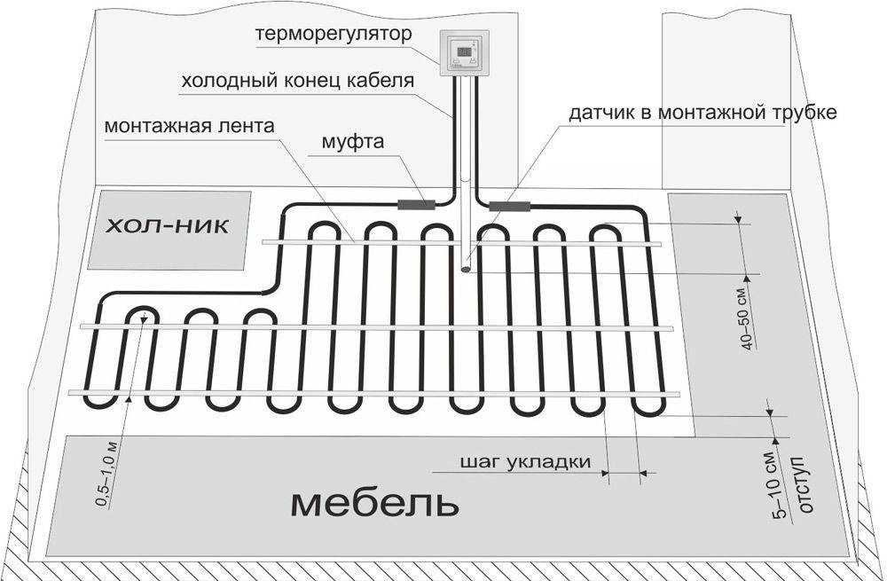 Монтаж нагревательного элемента в виде провода может быть выполнен по схеме «улитка» или «змейка». При разработке чертежа его укладки учитывают, что расстояние от кабеля до стены должно быть минимум 100 мм.