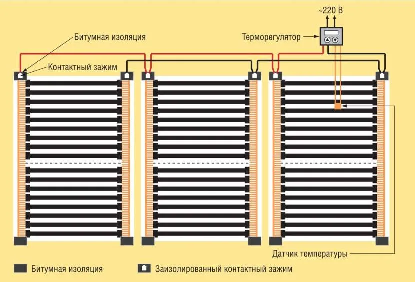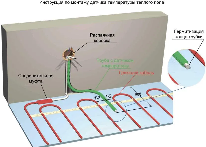 - монтируют термодатчик вместе с его проводами в гофре между нагревательными элементами и на удалении от стены минимум 500 мм;