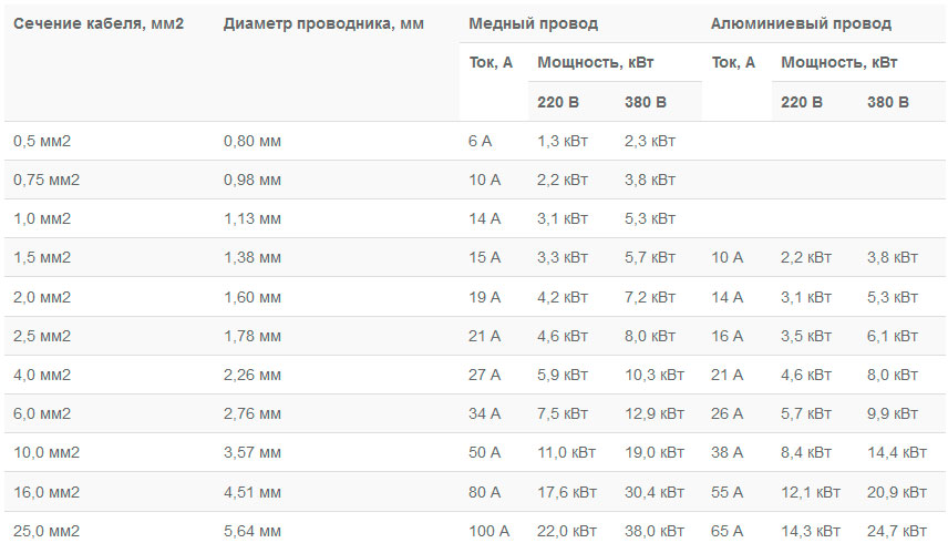 Таблица проводников под допустимый максимальный ток для их использования в проводке: