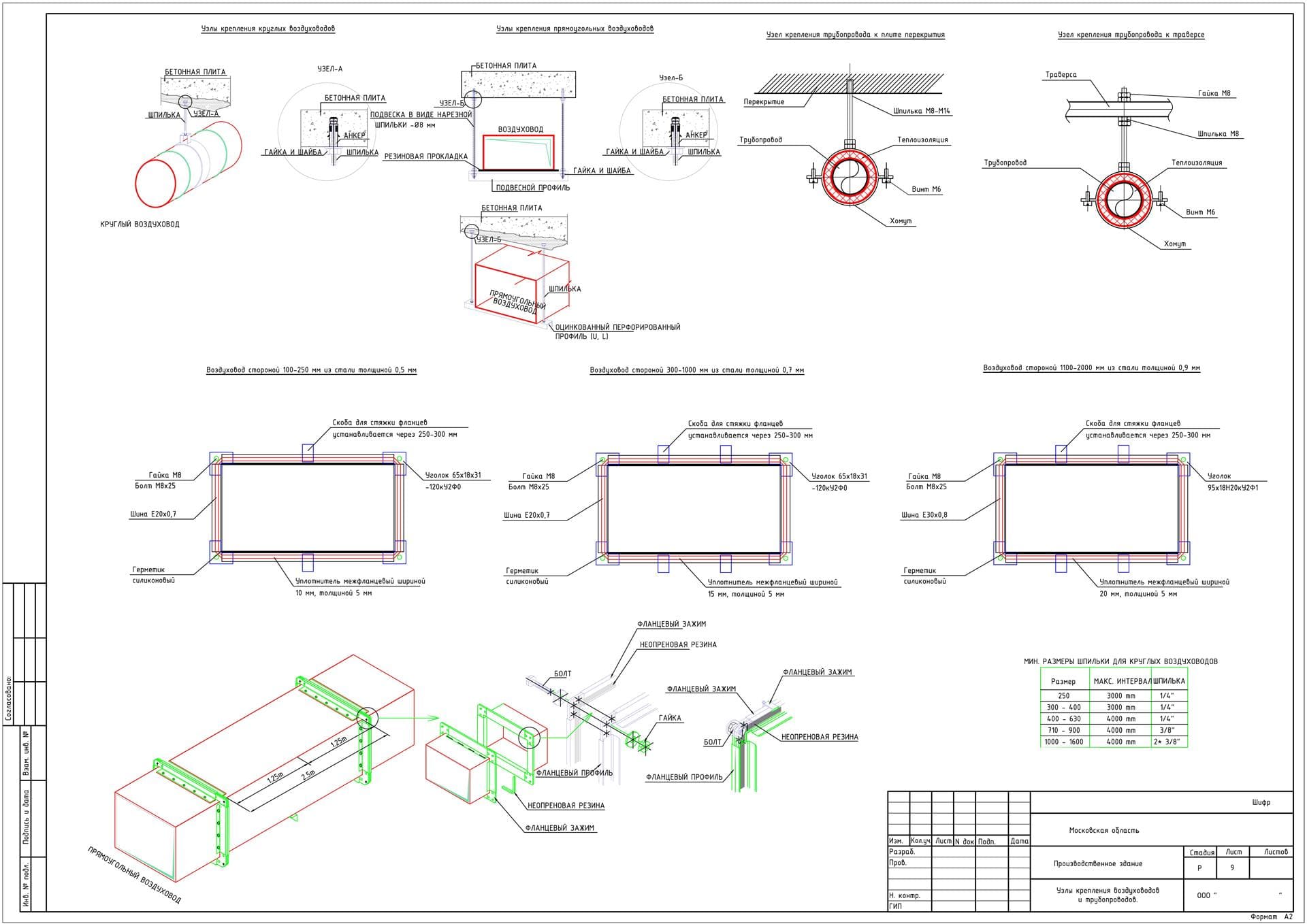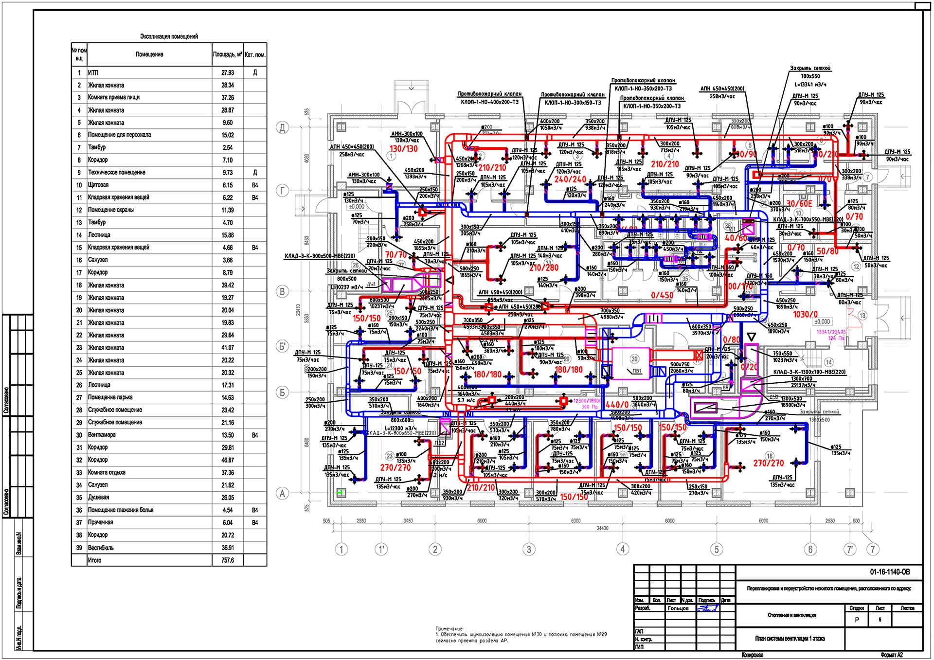 Комплект рабочих чертежей состоит из плана здания с нанесением на него вентиляционных трасс и указанием вентиляционных камер; чертежи вентиляционных камер в разрезе; подробные чертежи нестандартного оборудования, входящего в состав будущей вентиляции.