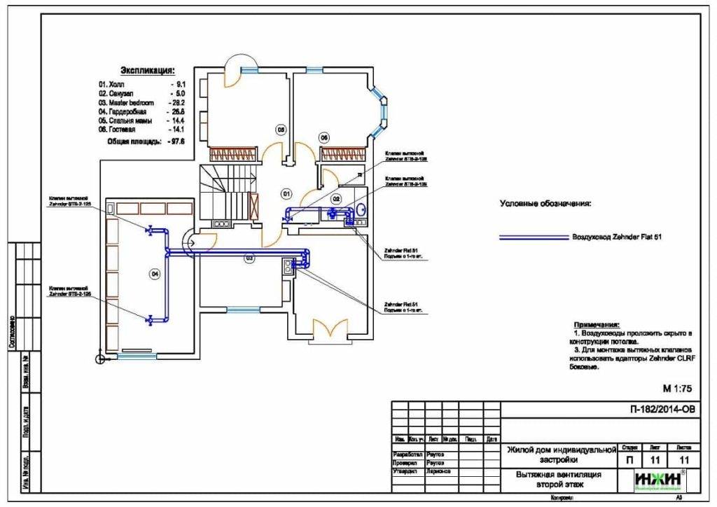 На втором этапе проектирования вентиляции нужно определить диаметры воздуховодов с обоснованием, сможет ли требуемый расход воздуха пройти сквозь совокупное сечение патрубков.