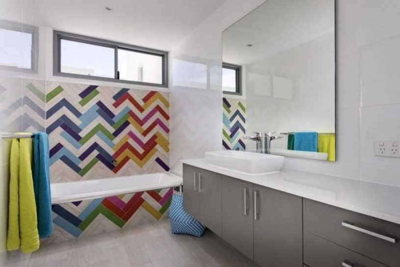 С образцами яркой палитры ситуация обратная. Их разбавляют нейтральными оттенками. Используются они для зонирования площади: раковины, кухонного фартука, туалета.