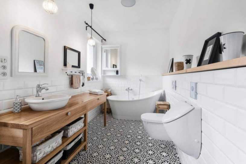 Но сделать перестановку в помещении при выборе такого типа расположения непросто. Также для экономии можно положить керамическую плитку только в зонах, наиболее подверженных воздействию воды — душевая, непосредственно около ванны или раковины, а остальную площадь покрыть более бюджетными материалами.