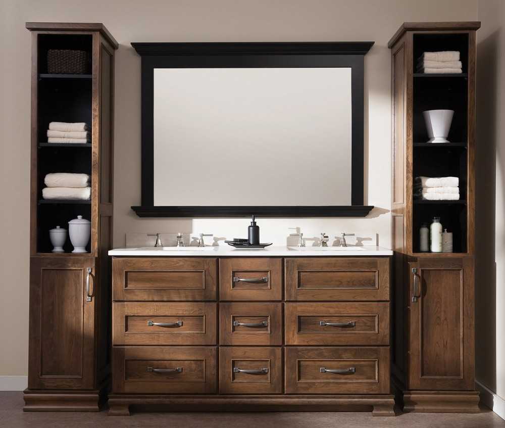 В основном, древесину применяют для изготовления фасада и дизайна мебели, иногда для производства столешниц. Основная часть гарнитура собирается из мелкодисперсионной фракции (МДФ). Деревянную мебель лучше разместить в просторной ванной (>15 м²), с уровнем влажности не превышаемым 60% и хорошей циркуляцией воздуха.