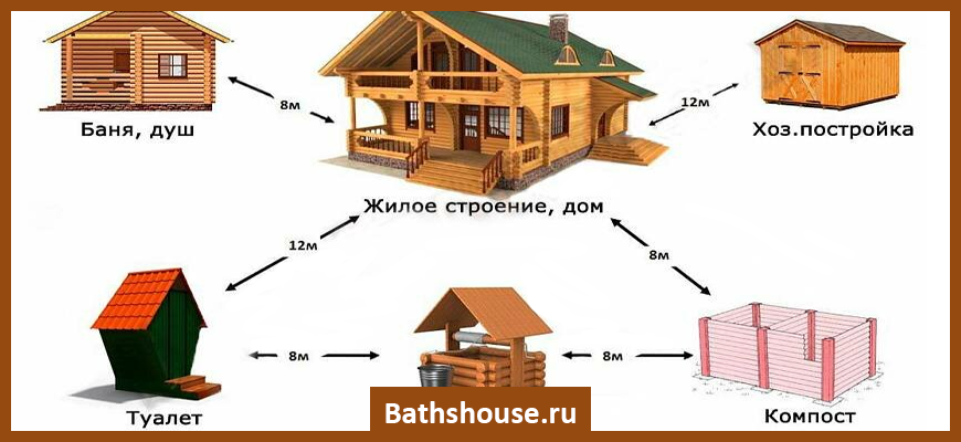 - Расстояние от жилого дома до бани (сауны) должно составлять не менее 8 метров.