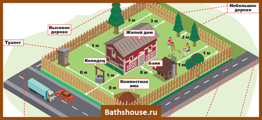 На законодательном уровне утверждено, какая дистанция допускается между зданиями у себя участке и какой должен соблюдаться отступ до забора соседей или сооружений. К примеру, расстояние от бани до следующих объектов: