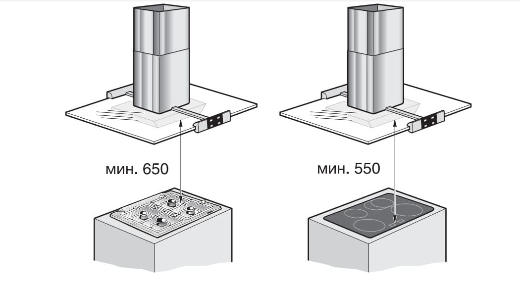 Здесь приведены минимальные показатели расстояния между поверхностью плиты и вытяжной. Можно немного увеличить его при необходимости. Но меньше оно никак быть не может. Этот момент всегда следует учитывать.