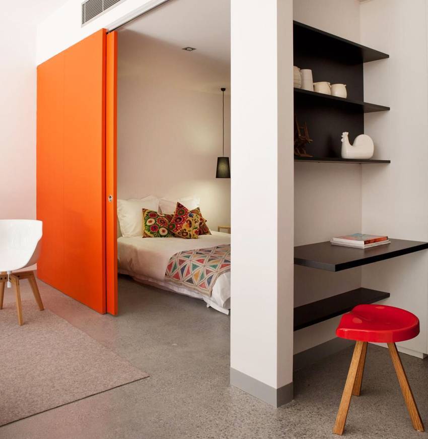 Раздвижную дверь можно увидеть в квартирах-студиях. Она позволяет оградить некоторое пространство для работы или сна от чужих глаз. Также это хорошее решение для помещений, где одновременно проживают члены семьи разного возраста.