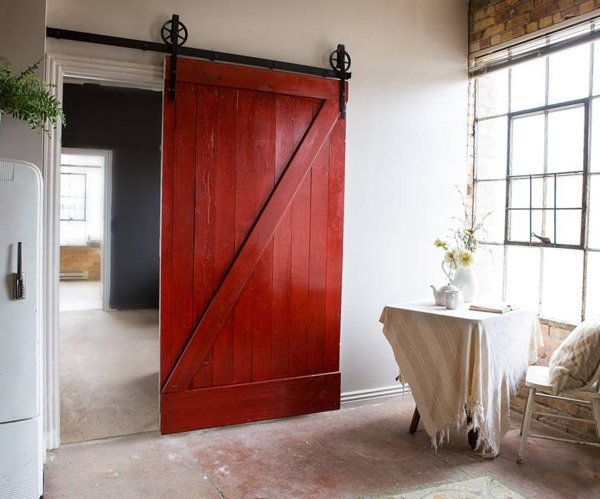 Дверным полотном может выступать любая дверь, требуется установить лишь раздвижной механизм