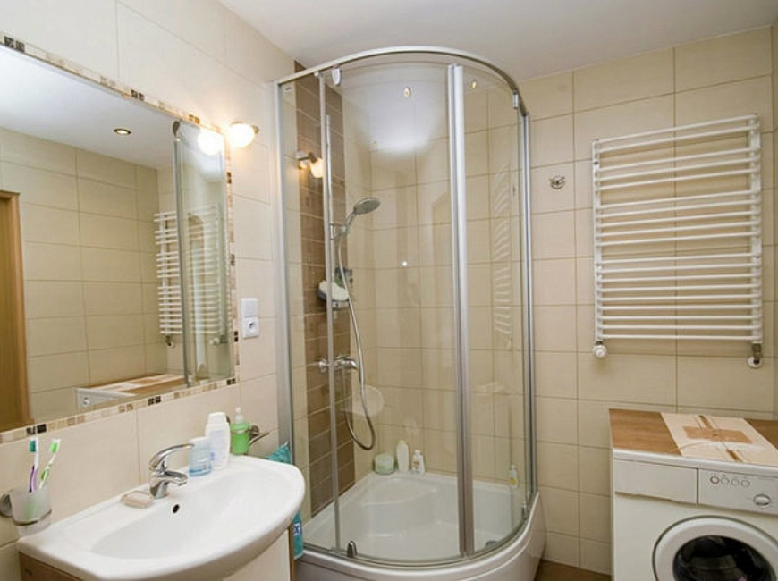 Покупая душевую кабинку для малогабаритного помещения, стоит выбрать изделие со светлыми либо прозрачными дверцами, что позволит зрительно увеличить свободное пространство.