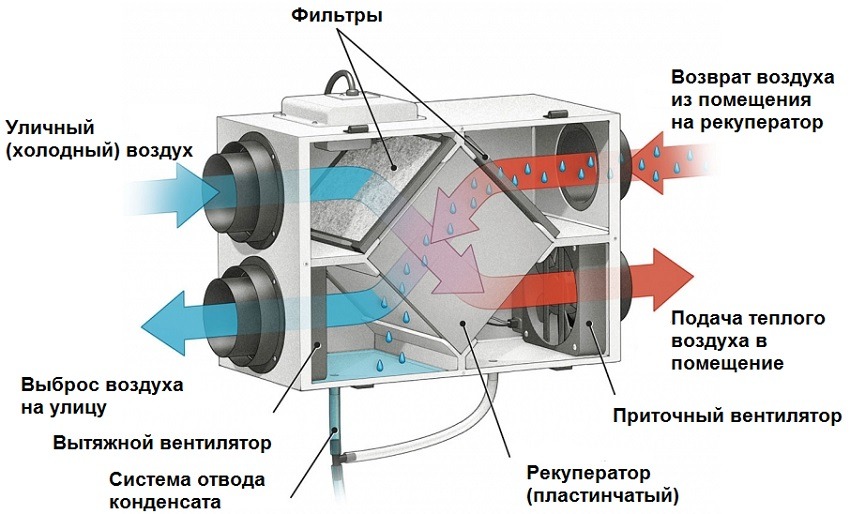 Самым популярным типом устройств считаются пластинчатые рекуператоры. Теплообменником выступает слоенная кассета из металла с высоким показателем теплопроводности. Каналы расположены так, что приточные и вытяжные потоки воздуха не контактируют между собой, а происходит процесс передачи тепла через металлические пластины. Фильтры способствуют проникновению чистого воздуха в квартиру, а система отвода конденсата обеспечивает сток влаги.