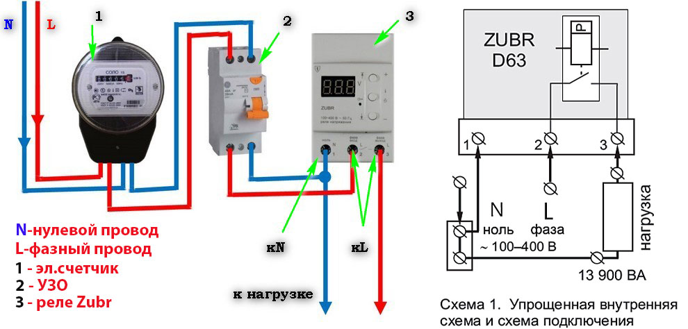 Схема подключения реле контроля напряжения «Зубр»Реле напряжения Зубр