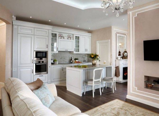 Также для оформления объединенного пространства можно выбрать неоклассический стиль интерьера