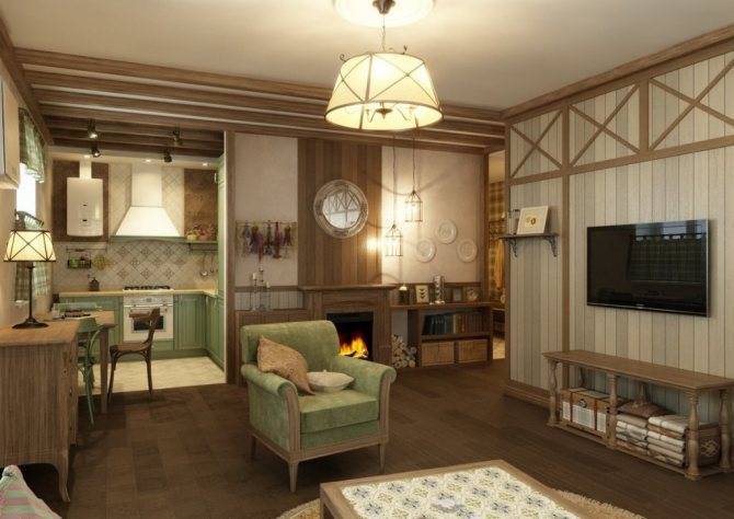 На фото кухня-гостиная в четырехкомнатной брежневке, выполненной в стиле кантри