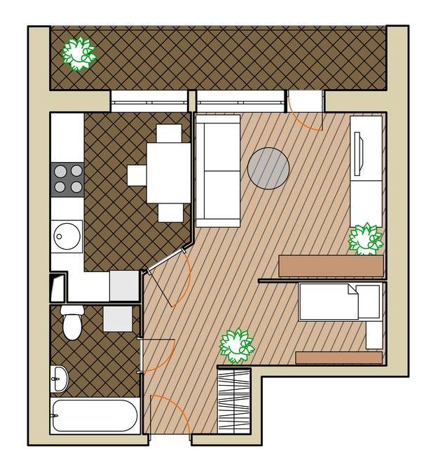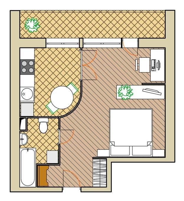 Однокомнатные брежневки довольно часто подвергаются современной перепланировке. Кухня, жилая комната и балкон объединяются в одно общее жилое помещение, образуя тем самым квартиру-студию.