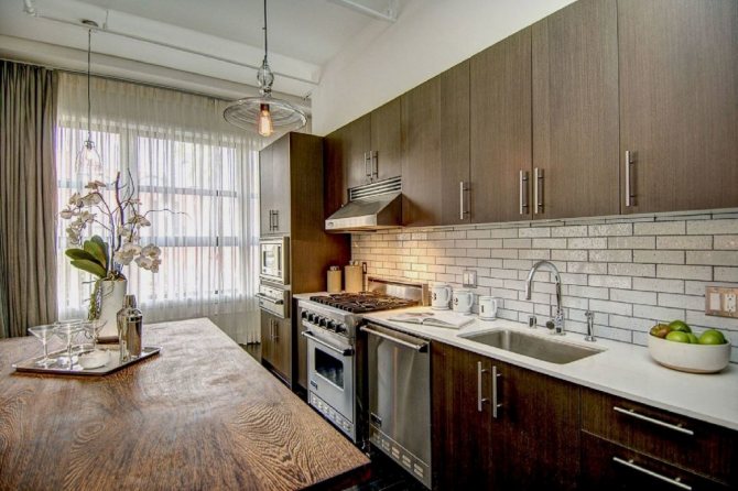 Очень необычно будет смотреться стиль лофт. Имитация белой кирпичной кладки на стенах в сочетании с темными фасадами мебели превратят старомодное помещение в изысканную и современную кухню.