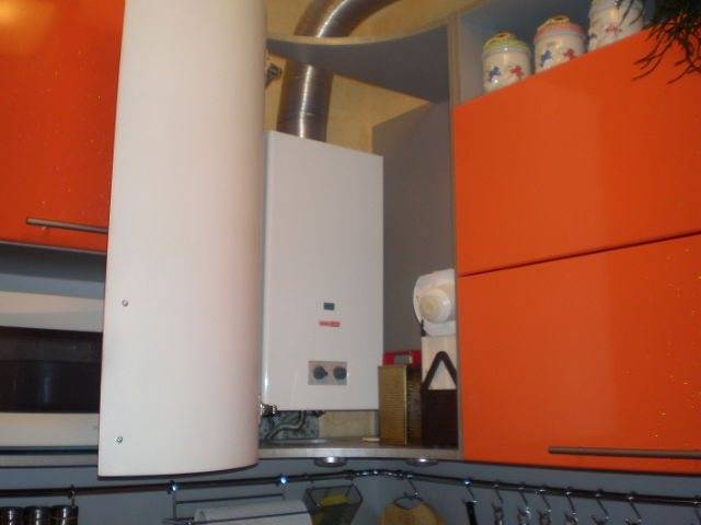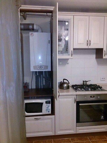 Прежде чем приступать к данному процессу, следует проконсультироваться у специалистов. Если такой агрегат имеет отрытую газовую камеру, то лучше замаскировать его фальш-шкафом, у которого отсутствуют верх и низ. Если газовая камера закрыта, то шкаф может быть настоящим. Газовую колонку следует устанавливать на одном уровне с навесными тумбами.