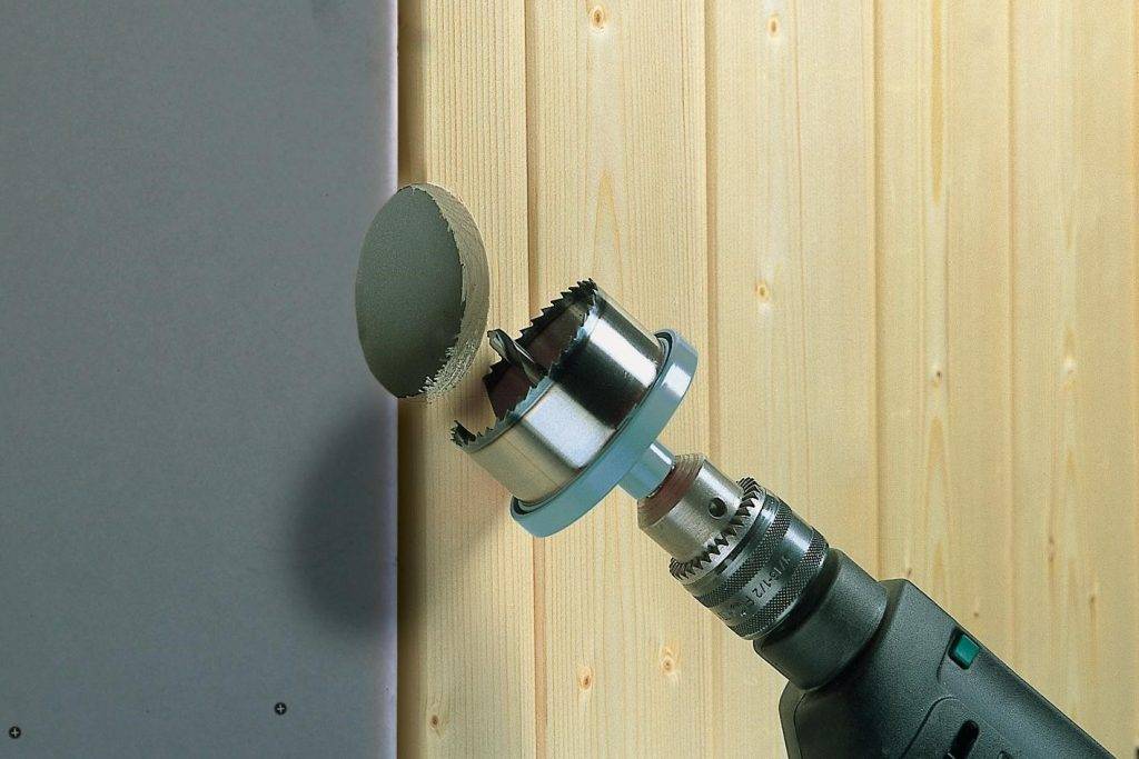 - На дрель фиксируется насадка расширитель, с помощью которой устраиваются крупногабаритные отверстия под глазок и замки.