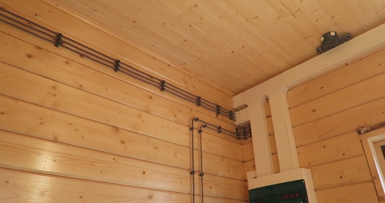 К деревянным постройкам предъявляются высокие требования по обеспечению пожарной безопасности. Прокладывать здесь провода скрытым образом разрешают только в несгораемых кабель-каналах или толстом слое штукатурки (от 2 см). В первом случае придется зашивать стены и потолок листовым материалом по каркасу, поскольку штробить стены сложно (из бревен) или невозможно (СИП-панели). Устройство ретро проводки обойдется дешевле и не приведет к сокращению полезной площади.
