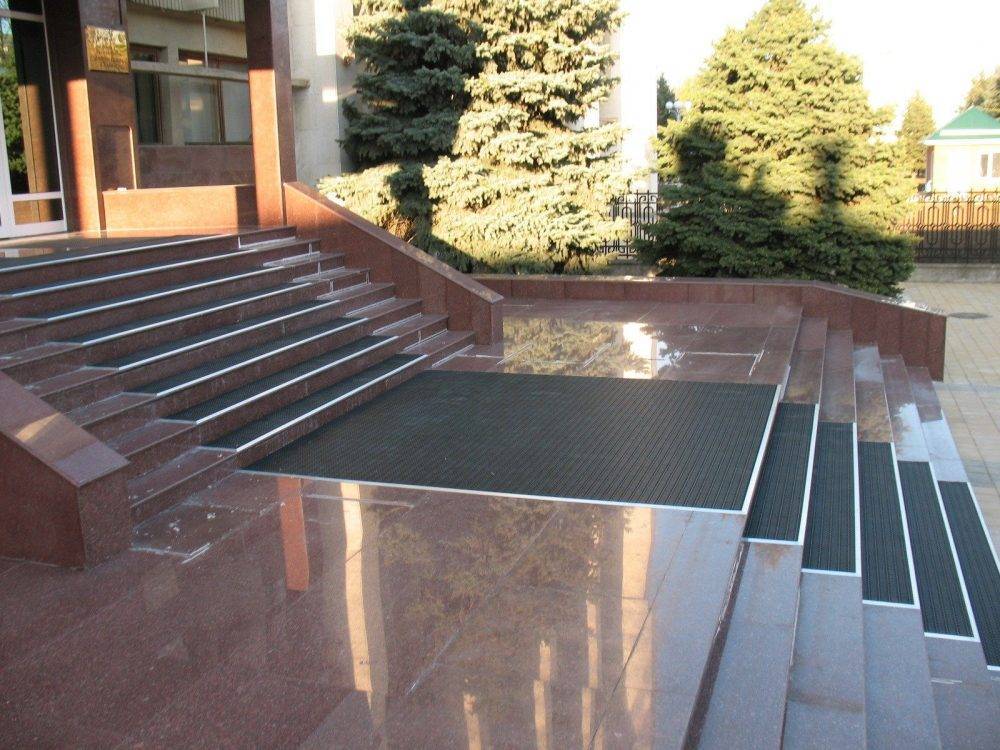 Такие материалы обеспечивают антискользящий эффект, зачастую на них наносятся рельефные полоски, служащие для удаления грязи с обуви и облегчающие процесс уборки.