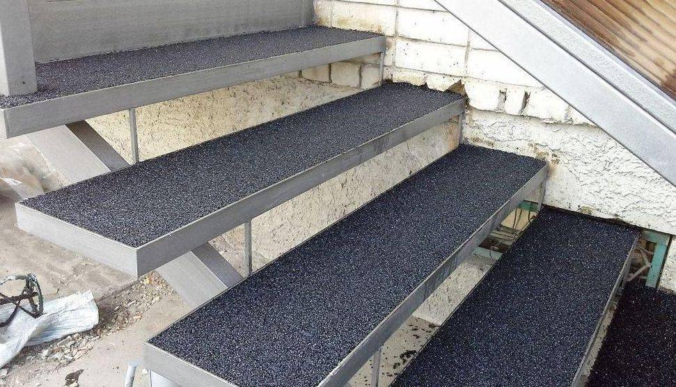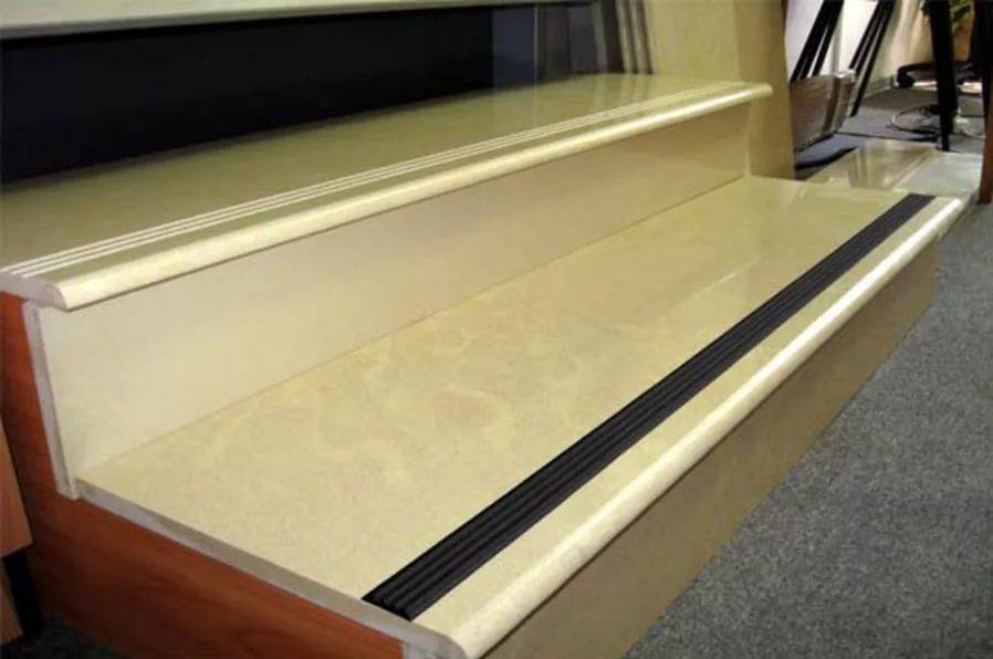 Для ступеней может быть выполнено в виде цельной ступени или накладки на проступь, с небольшим загибом на подступенок или без него. Оно укладывается на ступени из различных материалов (бетон, дерево, керамика, металл, асфальт), в том числе и облицованные.