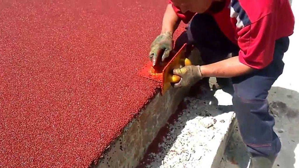 Его производят непосредственно на месте установки путем смешивания крошки, полиуретанового клея и пигмента. Оно может укладываться как на улице, так и в помещении. Температура воздуха должна быть больше +5 градусов. Нанесение смеси на улице проводится исключительно в сухую погоду.