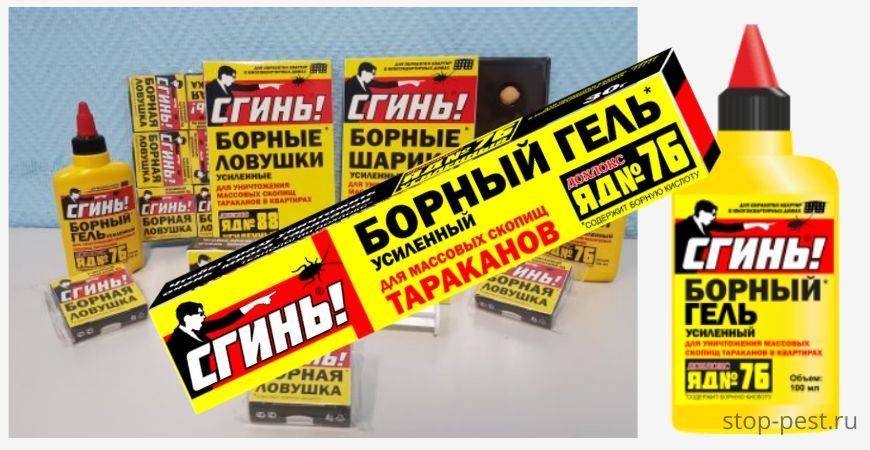 Выпускается в различных видах (клеевые ловушки, шприцы, гели, порошки, спрей и другие). Для быстрого использования интерес представляют ловушки. Эдакий вариант для ленивых. Разложили по всем «любимым» местам тараканов и ждём результата. А он не заставляет себя ждать. Насекомые действительно исчезают. Правда через пару месяцев словно по волшебству появляются снова, если результат не закрепить свежей партией ловушек. Стоимость около 200 рублей.