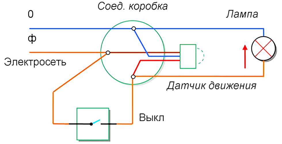 Принудительного отключения датчика. Если возникает необходимость полного вырубания света в помещении, в котором установлен датчик движения, применяют схему разрыва цепи питания при помощи выключателя. При обесточивании, лампа перестаёт работать, и гореть она не будет до тех пор, пока выключатель снова не активирует датчик, а он, в свою очередь, осветительный прибор. Устанавливают такие устройства в целях экономии электроэнергии в помещениях с естественным освещением (верандах, летних кухнях и т. д.) на период, когда ими редко пользуются.