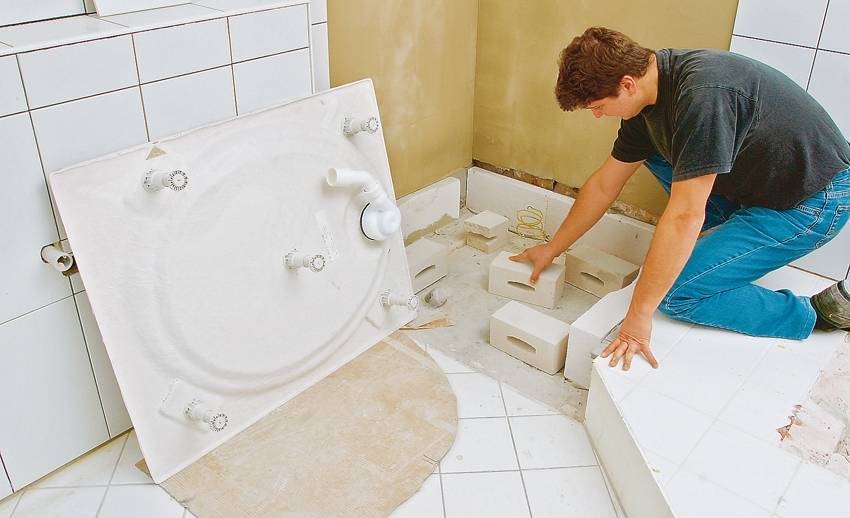 Место под установку поддона должно быть полностью очищенного от строительного мусора и пыли. Нижний ряд облицовочной плитки на стенах укладывается после монтажа душевого трапа. Участок стены вблизи поддона и 10-15 см над ним следует покрыть слоем гидроизоляционной смеси, используя при этом валик или кисточку. Количество слоев определяется состоянием поверхности, однако их должно быть не менее двух.