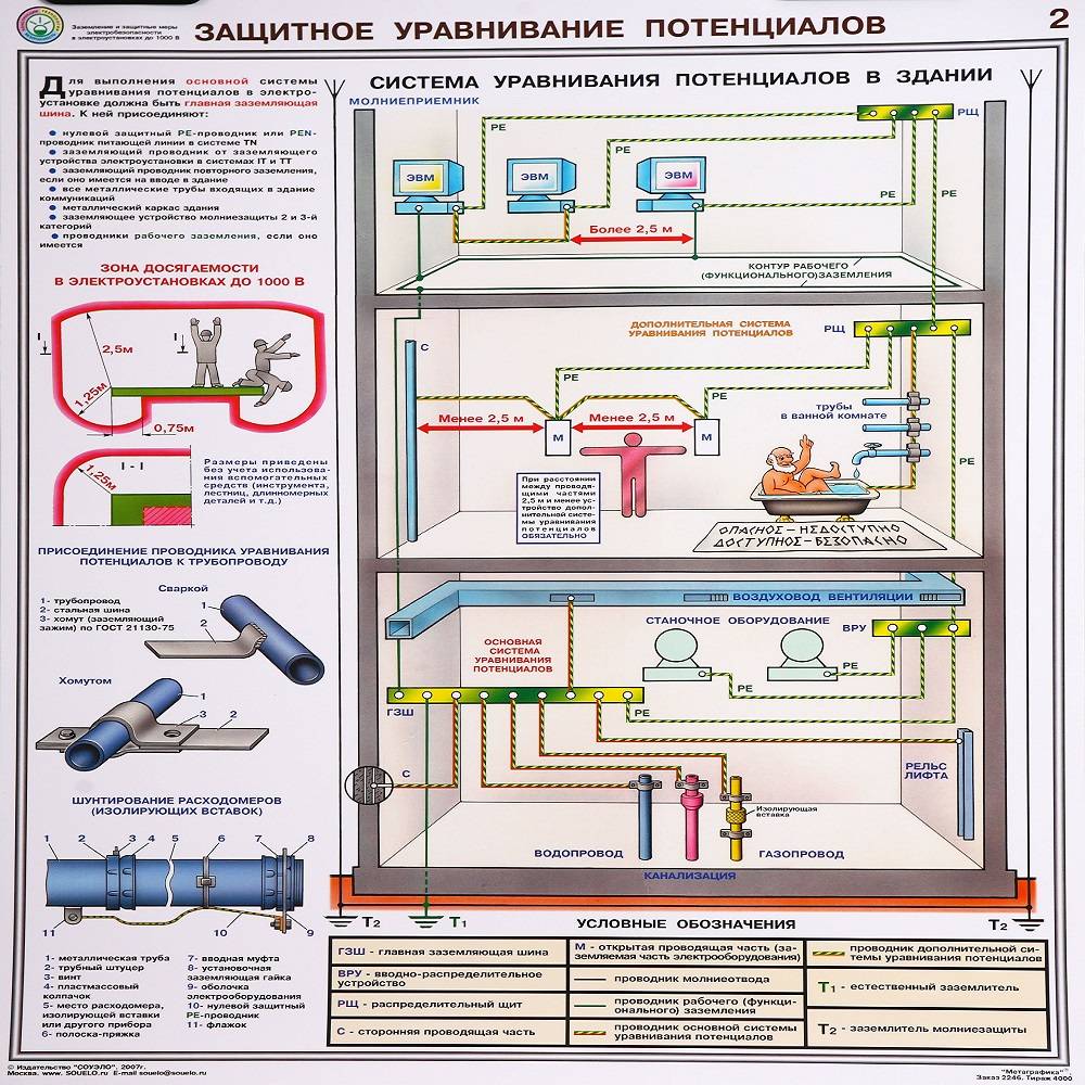 Дополнительная система уравнивания потенциалов служит для соединения между собой всех металлоконструкций, доступных для одновременного прикосновения к ним одним человеком. То есть они расположены близко друг к другу, и появление потенциала на одной из СПЧ (ОПЧ) относительно рядом расположенной может привести к поражению электрическим током.