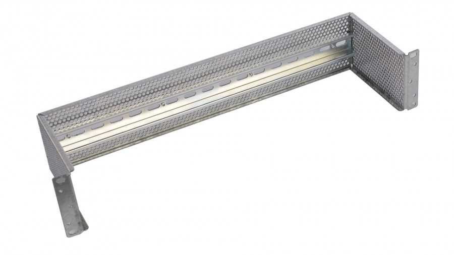 Omega-тип имеет совершенно другое сечение, сходное с греческой буквой “омега”: концы планки резко отогнуты в обе стороны от рейки, образуя своеобразные “ушки”. Такая конструкция адаптирована практически под все электротехнические элементы и приборы.