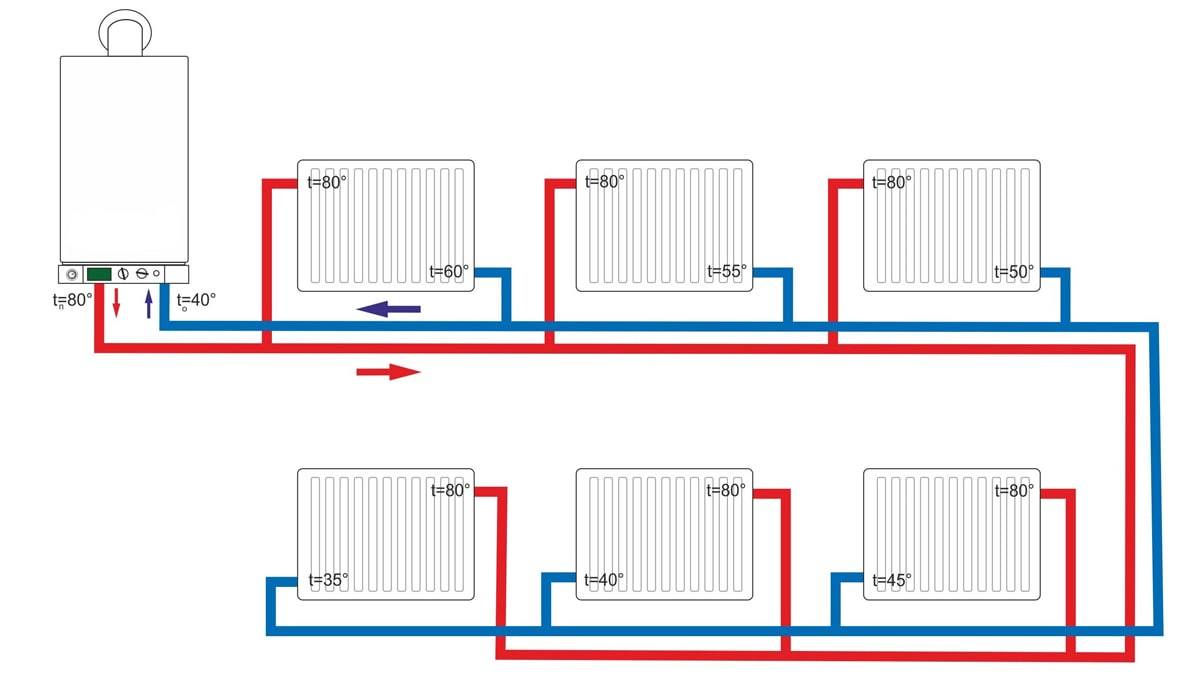 Тупиковая схема носит другое название — со встречным движением теплоносителя. Схема разделена на участки. По трубе от котла до самой дальней батареи поступает нагретый теплоноситель, который по обратной трубе возвращается в котёл. Популярность придаёт простота понимания, но требуется грамотный расчёт и настройка системы. Чем дальше от котла, тем тоньше должны быть трубы. После запуска проводят регулировку каждого радиатора отсекающими вентилями. Неправильная регулировка может привести к тому. Что весь теплоноситель будет проходить через один радиатор, остальные останутся холодными.