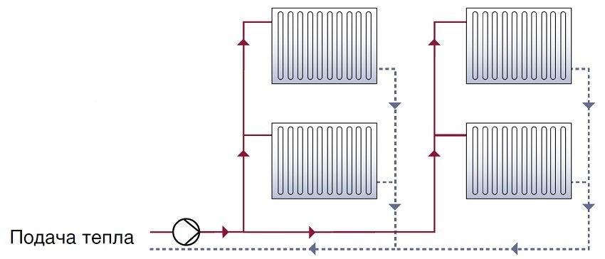 Тупиковая схема носит другое название — со встречным движением теплоносителя. Схема разделена на участки. По трубе от котла до самой дальней батареи поступает нагретый теплоноситель, который по обратной трубе возвращается в котёл. Популярность придаёт простота понимания, но требуется грамотный расчёт и настройка системы. Чем дальше от котла, тем тоньше должны быть трубы. После запуска проводят регулировку каждого радиатора отсекающими вентилями. Неправильная регулировка может привести к тому. Что весь теплоноситель будет проходить через один радиатор, остальные останутся холодными.