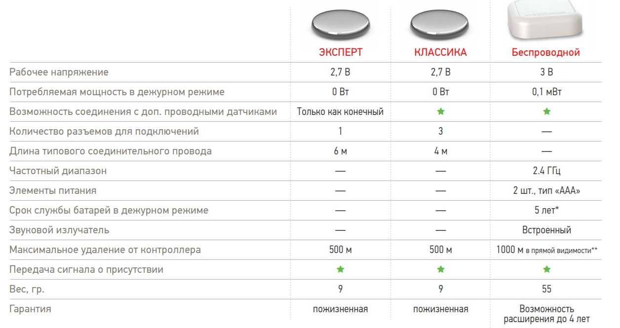 - Эксперт. При том же внешнем виде и размерах, дополнительно встроена плата, которая тестирует состояние контактов и целостность линии до контроллера. По результатам теста в контроллер посылается сигнал нормального рабочего состояния или обрыва. Длина кабеля 2 м, 4 м, 6 м, 10 м, максимальное удаление — 500 м. Эксплуатироваться могут при температуре от -40°C до +60°С.