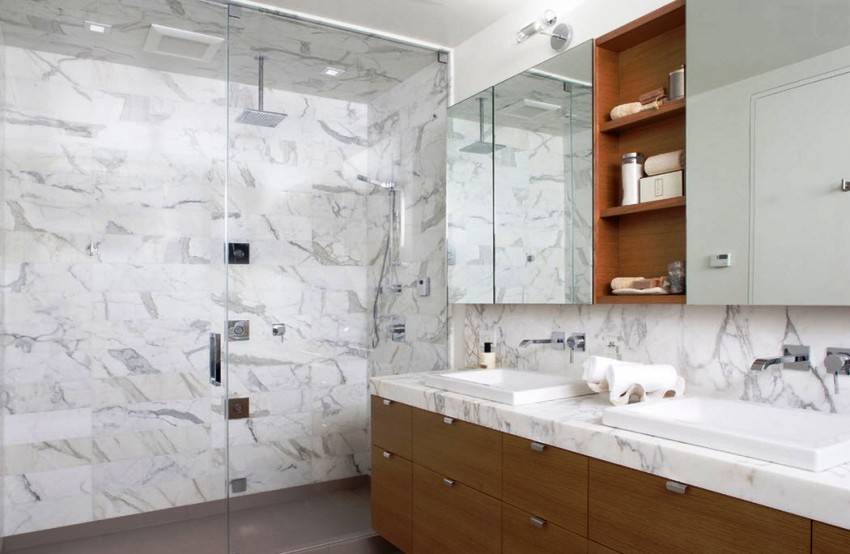 Можно повесить с обратной стороны фасада, а можно подобрать модель с зеркальным фасадом. Это позволит сделать пользование санузлом более комфортным, а зеркальные поверхности фасадов визуально расширят узкое пространство.