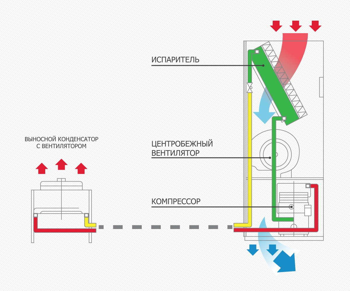 Оснащенный системой непосредственного испарения и выносным конденсатором воздуха. В такой компоновке конденсатор с вентиляцией дислоцируется на открытом воздухе, а связь со шкафом происходит с помощью трубопровода