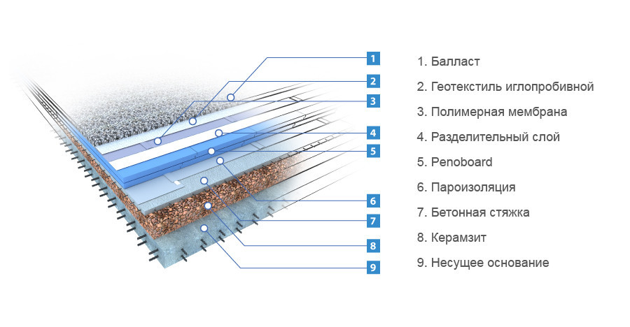 Структура гидроизоляции плоской кровли на бетоном перекрытии.